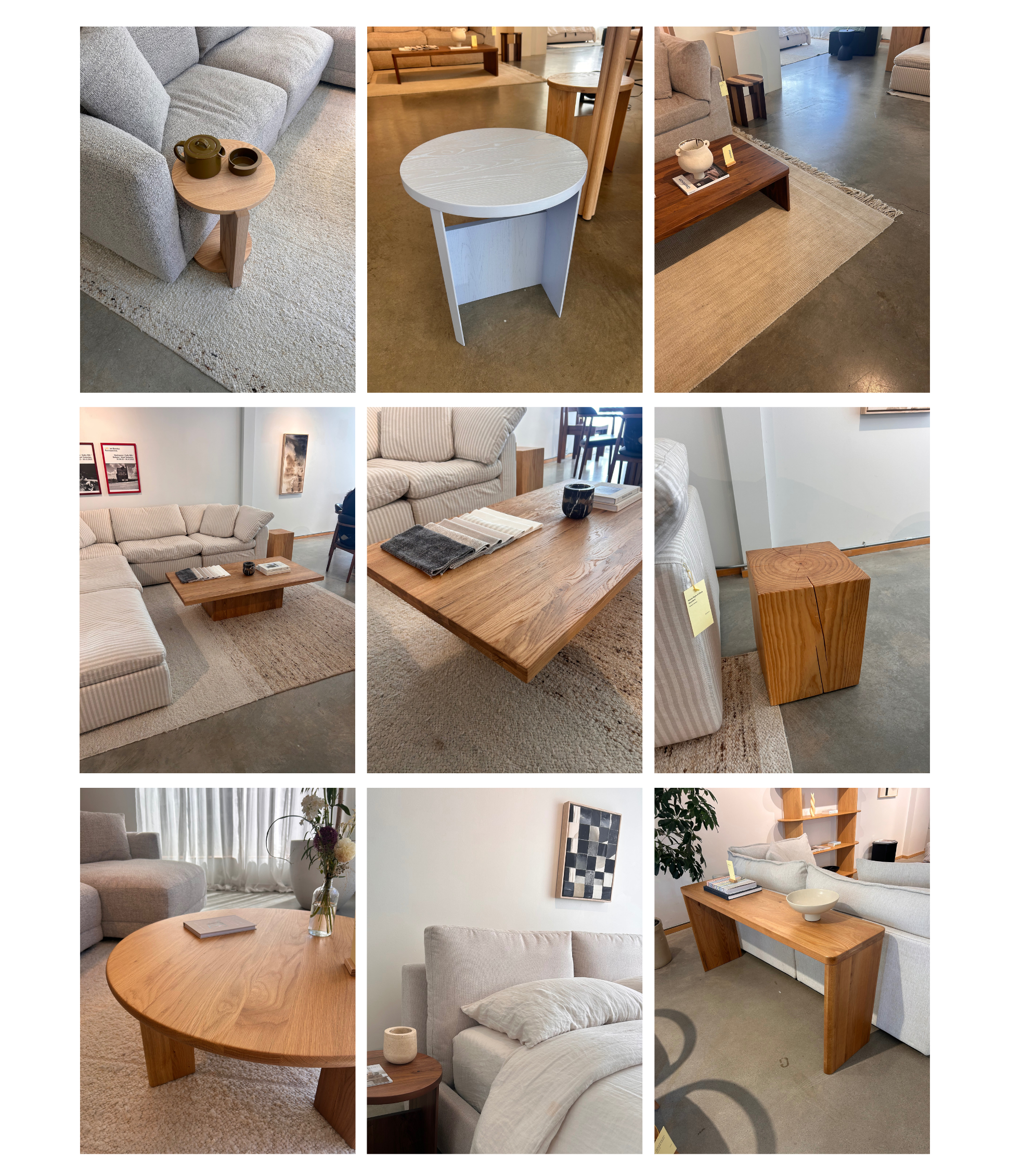 What caught my eye — the Bowen Rug, a neutral, but soft and super textural rug that would work in any space. The Field Stool — I snapped a photo of the Glacier finish. It is super versatile, and I love how the wood grain comes through. And the Poppy finish is too good! The Plane Coffee Table was amazing. So, so good. This piece feels really substantial. And for a side table, I love to use something that is solid wood, such as the Amalfi Stool. It has so much character.